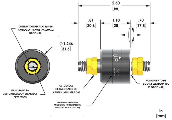 | 1250-SX | Acero inoxidable (303) | Sello | 3/8 – 16 | 250 | 1 | |||||||||