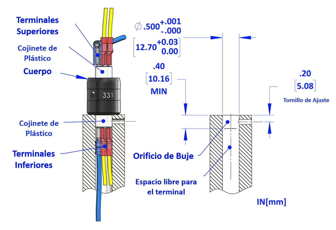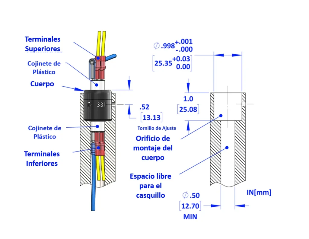 El modelo 331 generalmente se monta mediante el cuerpo negro o el casquillo de plástico blanco en cada extremo usando un tornillo de fijación o una abrazadera dividida. Cuando se use horizontalmente, monte el Mercotac de modo que el cuerpo del conector gire