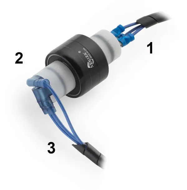 1. Conexiones de cables, montadas dentro del eje giratorio. 2. Extremo estacionario que muestra conexiones de cables estándar. 3. Los cables se engarzan en los terminales. (Herramienta sugerida: Thomas & Betts #WT 112M)