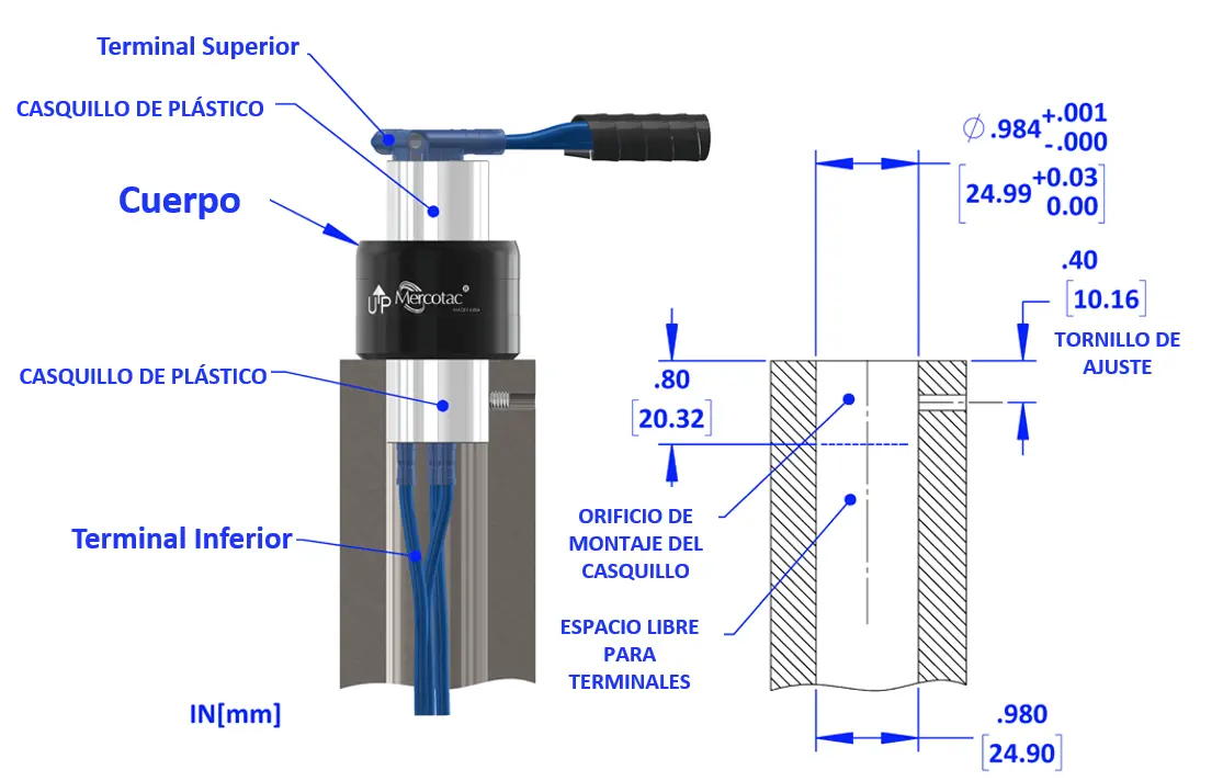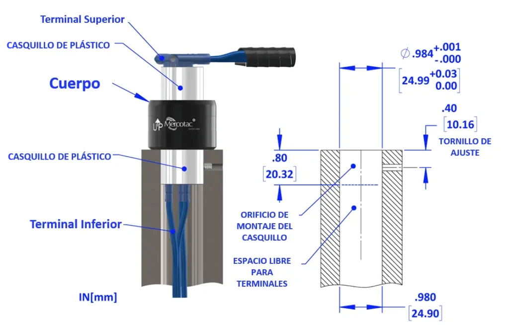El modelo 335 generalmente se monta mediante el cuerpo negro o el casquillo de plástico blanco en cada extremo usando un tornillo de fijación o una abrazadera dividida. Cuando se use horizontalmente, monte el Mercotac de modo que el cuerpo del conector gire.